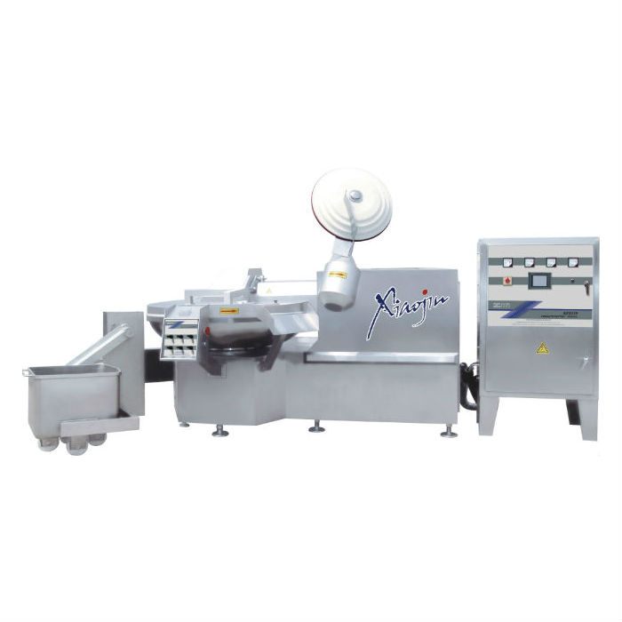 斬鍋由電機通過減速機低速(sù)旋轉,不斷向刀組送料。刀(dāo)軸由雙速電機(或變頻電機)經皮帶帶動高速旋轉。原料在斬鍋中作螺旋式運動的同時,被(bèi)刀組攪拌和(hé)切碎並(bìng)排除肉糜中的空氣,由於(yú)切刀(dāo)的高速斬切,減少了產品的液(yè)汁分(fèn)離率,保證了(le)乳化效果,增強了產品的(de)彈性和細膩度。