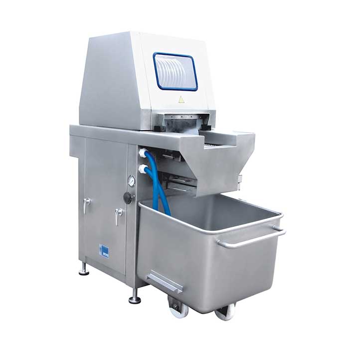 ◇ 可帶骨注射(設有自動保護裝置,當注射針碰(pèng)到硬物時,注射針隨之抬起,不受損壞;注射針可方(fāng)便調節安裝(zhuāng))。注射針設計獨特、排列合理,料水可均勻分布(bù)在(zài)肉塊中,注射率可調。