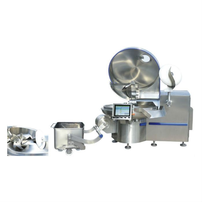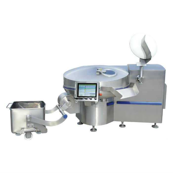 利用斬刀高(gāo)速旋轉的斬切作用(yòng),將肉塊、碎肉、脂肪等主要原料精細的斬切成肉餡或肉泥,同時將(jiāng)其它原料如水,冰片,輔料一起攪拌均勻。